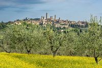 Uitzicht over een lenteweide en olijfbomen naar San Gimignano, Toscane, Italië van Walter G. Allgöwer