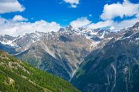 Uitzicht over het Ötztal vanaf het skigebied Ötztal Arena in Tirol in de Oostenrijkse Alpen tijdens een mooie lentedag. Zonlicht valt op de vallei beneden terwijl er wat wolken hangen boven de besneeuwde bergtoppen op de achtergrond.