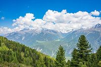 Uitzicht over het Ötztal in Tirol in de Oostenrijkse Alpen tijdens een mooie lentedag. Zonlicht valt op de vallei beneden terwijl er wat wolken hangen boven de besneeuwde bergtoppen op de achtergrond.