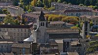 Opname van het historische centrum van Sisteron, ook wel de poort naar de Provence genoemd, in het zuiden van Frankrijk met de kerk Notre-Dame-des Pommiers (Romantiek) omringd door oude gebouwen in de herfst met verkleurende loofbomen.
