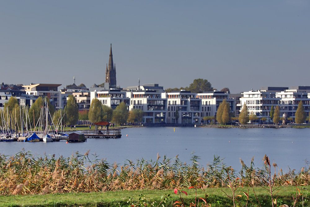 Skyline van Dortmund aan de Phoenixsee in Dortmund Hörde