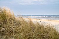 Uitzicht over het strand op Usedom met duinen aan de ene kant en de Baltische Zee aan de andere kant. Zandstrand en duinen. Landschapsopname bij de zee