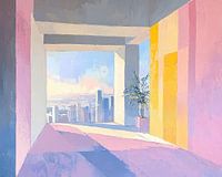 Uitzicht planten | Uitzicht Ruimte - Op dit moderne landschap schilderij zie je een helder uitzicht vanuit een open ruimte, met zachte tinten zoals lichtblauw, geel en roze, terwijl een groene plant in een pot het interieur verfraait.