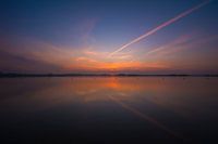 Zonsondergang aan het strand, gemaakt met een lange sluitertijd overdag. Hierdoor is beweging van het water en lucht vervaagd.
