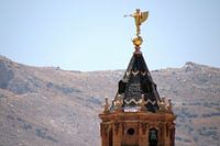 Kerktoren in Antequera Spanje met gouden windvaan en uitzicht op de omringende bergen.