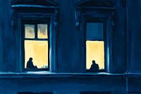 In de diepblauwe schemering verlichten warme, gele ramen een stil tafereel. Twee silhouetten zitten naast elkaar, verloren in een intiem gesprek. Deze melancholische sfeer nodigt uit tot dromen en creëert een uitnodigende sfeer - ideaal voor de woonkamer, waar dialoog en gezelligheid elkaar ontmoeten. Een look die verhalen vertelt en harten raakt.