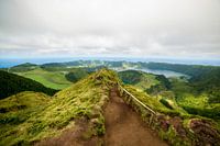 Wandelpad naar het uitzicht van Boca Do Inferno. Prachtige wandelroute / hike om de meren / kraters van Sete Cidades. Eind van het groene eiland Sao Miguel, deel van eilandengroep de Azores, Portugal. Uitzicht op de Atlantische Oceaan.