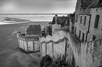 Het uitzicht is langs de buitenmuur van de abdij van Mont St Michel in de richting van de Atlantische Oceaan.