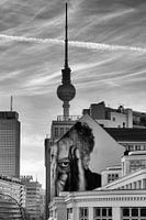 Berlijnse televisietoren achter huisgevel met muurschildering. Zwart-wit foto uit Berlijn.