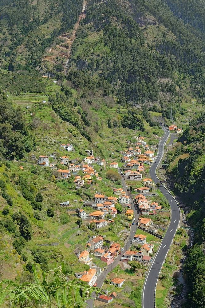 Vroeger was de weg over de Encumeada-pas een van de noord-zuidverbindingen op het eiland Madeira. Tegenwoordig leidt een tunnel gemakkelijk naar het noorden (zichtbaar op de achtergrond van de foto). Hier het uitzicht vanaf de pasweg naar het dorp Lombo do Moleiro. Op de voorgrond staat een bloem van de Afrikaanse lelie, die massaal langs de weg bloeit. Genomen in het voorjaar van 2023.