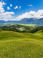 Uitzicht vanaf de Hoher Kranzberg op het Karwendelgebergte en het Estergebergte bij Mittenwald.