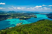 Uitzicht vanaf de Pyramidenkogel-observatietoren op de Woerthersee in Oostenrijk