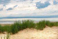 Uitzicht vanaf de duinen op het zandstrand van de Noordzeekust aan de kustlijn op de Maasvlakte bij Rotterdam in Nederland tijdens een mooie zomerdag.