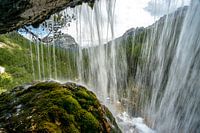 Uitzicht van de waterval naar de Dolomieten vanaf de via ferrata Cengia de Mattia