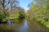 Wanneer je vanaf het bruggetje deze richting op kijkt is het uitzicht prachtig! Het water weerspiegelt de bomen ,struiken en de blauwe lucht. In het water een paar eenden, die een spoor achter zich trekken. Ver in de top van een boom land, als je goed kijkt ook nog een meeuw.