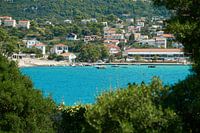 Uitzicht vanaf een heuvel in de oude stad door takken van bomen naar delen van de stad Rab op het gelijknamige eiland in de Adriatische Zee in Kroatië. Veel toeristen uit de hele wereld vieren vakantie in dit prachtige deel van Kroatië, of komen naar het eiland Rab voor een dag op een excursieboot. De prachtige kleur van het water en het uitstekende klimaat maken Kroatië, en vooral het eiland Rab, tot een onvergetelijke vakantiebestemming.