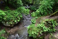 Het uitzicht vanaf een waterval in het bos in Luxemburg. Rotsblokken begroeid met planten waar het water langs stroomt maken een sfeervol plaatje.