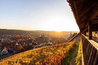 Uitzicht vanaf het kasteel met het kanteel over Esslingen am Neckar bij zonsondergang, Baden-Württemberg, Duitsland.