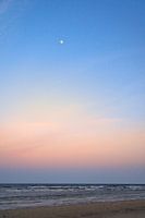 Uitzicht vanaf het strand op het eiland Usedom naar de Baltische Zee met de maan aan de hemel. Landschapsopname bij de zee