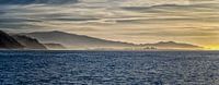 Uitzicht vanaf het strand van Almuñécar, Spanje. Ochtendmist voor de bergen in Salobreña.