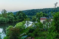Deze foto toont een rustig, weids uitzicht over de stad Rochlitz en de Zwickauer Mulde vanaf Kasteel Rochlitz. Op de voorgrond omlijsten dichte, groene boomtoppen de oevers van de rivier, die zachtjes door het landschap meandert. De weerspiegelingen van de lucht en de vegetatie op het wateroppervlak geven het tafereel een bijna meditatieve diepte. Rechts op de foto zijn de eerste gebouwen van de stad te zien, waaronder een opvallend huis met een rood dak dat harmonieus opgaat in de omgeving. Daarachter strekt zich een bebost heuvellandschap uit dat het oog naar de verte trekt.