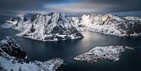 Uitzicht vanaf de Reinebringen top op Andoya en Olstinden in de besneeuwde winter, Lofoten
