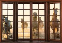 Een prachtig uitzicht vanuit een houten venster in een prachtig 3D beeld. Een echte eyecatcher voor aan uw muur waardoor het lijkt alsof je zo naar buiten kijkt.