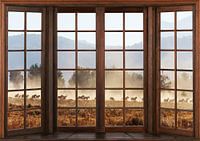 Een prachtig uitzicht vanuit een houten venster in een prachtig 3D beeld. Een echte eyecatcher voor aan uw muur waardoor het lijkt alsof je zo naar buiten kijkt.