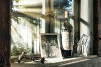 Boerderij-salon met wijnfles, kurkentrekker, glazen en fotografie op de vensterbank met uitzicht uit het raam. Deze studioshot is tot stand gekomen door twee opnamen samen te stellen. Eerst een studio-opstelling bij mij thuis en een buitenopname met ochtendmist in het Zwarte Woud. Ik heb een oude zwart-wit foto van mijn overleden ouders…