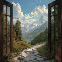 Geniet van het spectaculaire uitzicht op de majestueuze Alpen door een open raam. Deze prachtige landschapsposter brengt de schoonheid van de natuur in je woonkamer en creëert een rustige en ontspannen sfeer. Ideaal voor natuurliefhebbers en mensen die een gevoel van ruimte en vrijheid in hun huis willen. De levendige kleuren en gedetailleerde illustratie maken het een perfect decoratiestuk.