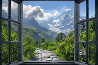 Geniet van het spectaculaire uitzicht op de majestueuze Alpen door een open raam. Deze prachtige landschapsposter brengt de schoonheid van de natuur in je woonkamer en creëert een rustige en ontspannen sfeer. Ideaal voor natuurliefhebbers en mensen die een gevoel van ruimte en vrijheid in hun huis willen. De levendige kleuren en gedetailleerde illustratie maken het een perfect decoratiestuk.