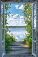 Ervaar de rust en sereniteit van een vredig meer gezien door een open raam. Deze poster brengt de kalmerende en verfrissende sfeer van de natuur in je woonkamer. Ideaal voor natuurliefhebbers en iedereen die een ontspannen en vredige omgeving wil creëren. De zachte kleuren en gedetailleerde illustratie maken het een perfect decoratiestuk.