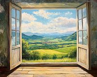 Uitzicht vanuit het raam - Op dit landschap schilderij zie je een prachtig uitzicht vanuit een open raam op een groene vallei met bergen op de achtergrond en een helderblauwe lucht met enkele wolken.