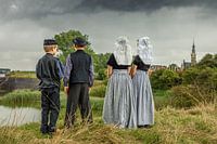 Uitzicht over de veste van Veere. De kinderen dragen de kleding van het Walchers Costuum. Op de achtergrond het stadhuis van Veere.