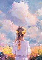 Uitzicht - Panorama bloemen. Panorama uitzicht meisje met bloemen. Impressionisme portret schilderij van vrouw bij een uitzicht op een landschap.