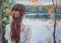 Uitzicht - Vrouw met bloemen. Panorama uitzicht meisje met bloemen. Impressionisme portret schilderij van vrouw bij een uitzicht op een landschap.