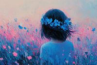 Uitzicht - Panorama met bloemen. Panorama uitzicht meisje met bloemen. Impressionisme portret schilderij van vrouw bij een uitzicht op een landschap.