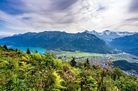 Prachtig uitzichtpunt vanaf Harder Kulm over het meer van Brienz, de Zwitserse Alpen en Interlaken. Deze kleurrijke foto heeft een echte vakantiesfeer.