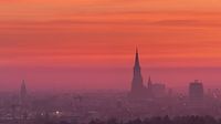 Ulm Minster en de stad Ulm in de ochtend bij zonsopgang met mist