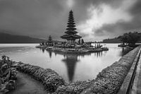 Ulun Danau Beratan tempel met zijn spiegelbeeld in het meer. In zwart wit. In Bedugul, Bali, Indonesie