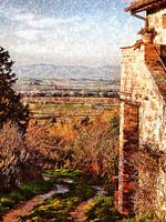 Het is vroeg lente en de zonsondergang nadert in Umbrië, Italië. De zon baadt het landschap in een prachtige gouden gloed, een ongelooflijk licht dat de kleuren bijna herfstachtig doet lijken en de stenen boerderij die is gebouwd met uitzicht op het uitzicht versterkt. Het is het seizoen om olijfbomen te snoeien, dus in de verte hangt een waas van rook van de vreugdevuren die het snoeihout verbranden. De oude boerderij heeft een deel van het dak dat nog net zichtbaar is en een klein balkon waarop nog net de vorm van een kat te zien is die naast een bloempot ligt te slapen. Een pad leidt de blik naar beneden naar een olijfgaard, badend in het licht en dan naar het landschap en de heuvels daarachter. Umbria Spring Sundown is een werk in impressionistische stijl gebaseerd op mijn originele foto die ik digitaal heb verbeterd.