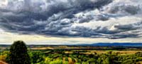 Deze zwaar impressionistische, gestileerde fotokunstafbeelding verbeeldt een avond met zware wolken en schaduwen boven een Italiaans landschap. Rijen olijfbomen leiden naar de verre bergen en een stukje heldere lucht voordat we de zware wolken erboven zien.