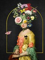 Het onwaarschijnlijke portret van een adellijke vrouw met een hoofdtooi vol bloemen en vlinders.