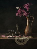 Een nostalgisch stilleven in de stijl van de Oude Meesters. Met een elegant aardewerk kruik met roze Magnoliabloemen, een gegraveerd glazen karafje en twee glazen rode wijn, een oud mes en een kanten kleedje op een oude houten tafel. Franse brocante voor de sfeer van vroeger.