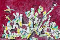Een abstract schilderij, mixed media. Acrylverf, pastelkrijt, olieverf, oostindische inkt, alle materialen zijn gebruikt. Dit schilderij is gemaakt in de geest van de kunststroming Cobra. Vrij als een kind aan het werk, het schilderij al doende laten ontstaan, expressief en kleurrijk.