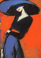 Under the Orange Sky - Dit vrouwen schilderij toont een elegante dame gekleed in een diepblauwe jurk en een overweldigende grote hoed tegen een levendige oranje achtergrond, in een stijl die balanceert tussen abstractie en figuratie waarbij vooral de grote, vloeiende vormen en gedurfde kleurcontrasten opvallen.