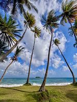 Op Pinfold Bay. aan de oostelijke kust van Tobago groeien palmbomen uit het gras dat aanvoelt als zacht mos. Een uniek stukje paradijs op aarde.