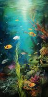 Een digitaal schilderij van een kleurrijke vissen onderwater. Dit kunstwerk heeft een langwerpige smalle vorm, waardoor het uitstekend geschikt is om de hoogte van een ruimte te benadrukken.
