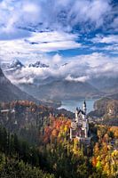 Werelderfgoed Kasteel Neuschwanstein op een zonnige herfstochtend met de besneeuwde Allgäuer Alpen op de achtergrond.