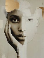 Een portret dat de grens tussen realiteit en verbeelding verkent. De ene helft levensecht, de andere een fragiele lijntekening, als een verhaal dat nog geschreven moet worden. De gouden accenten fluisteren over schoonheid, imperfectie en de kracht van transformatie.
